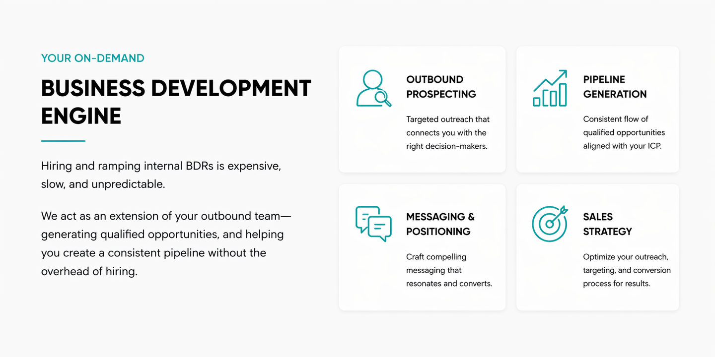 We help B2B tech companies with outsourced business development solutions. We act as an extension of your team to offer your company customized solutions that will scale growth and reduce risks.